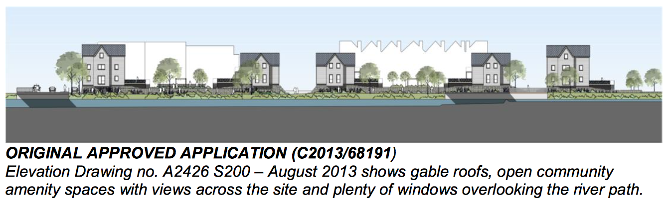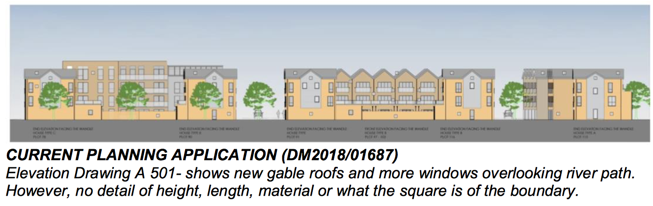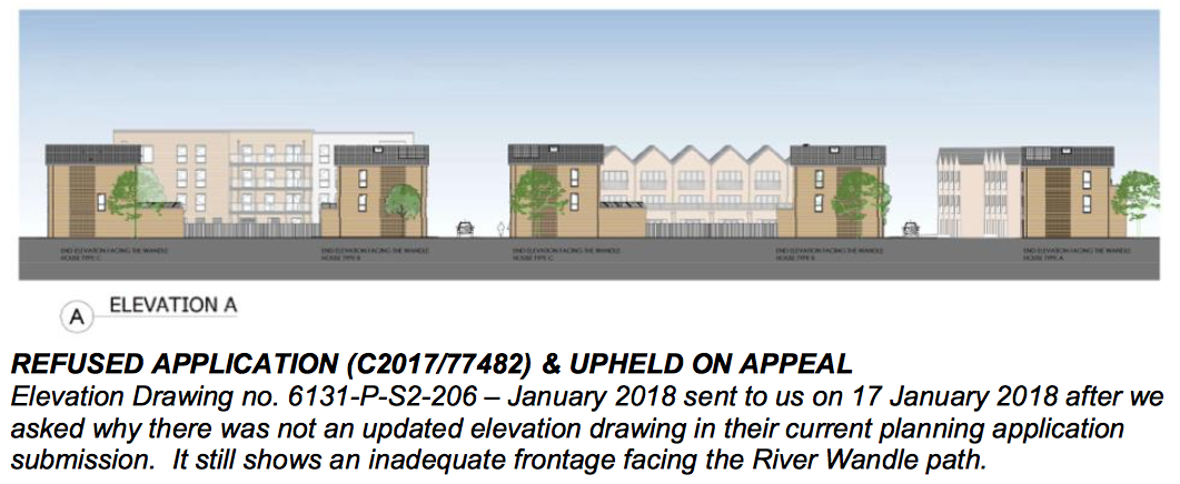We did fight very hard for better designs for the relationship with the River Wandle. You can see below the original design from City and Provincial and the many iterations from Redrow, which has still left us with a blank facade.