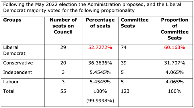 At the Local Elections, in May 2022, the Liberal Democrats won 29 seats, giving them a majority of 52.73%. At a Full Council Meeting a vote took place for the Liberal Democrat to have a two seat majority on every committee. This has resulted in the Liberal Democrats increasing their proportion of seats to 60.16%