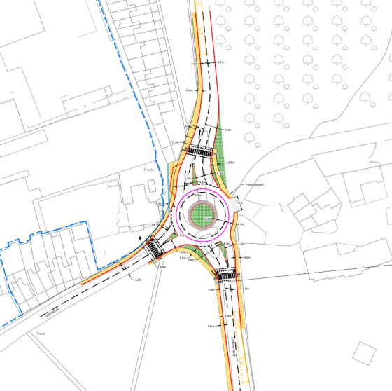New changes proposed from a roundabout with zebra crossings to fully controlled junction, with two staggered crossings for each main road.